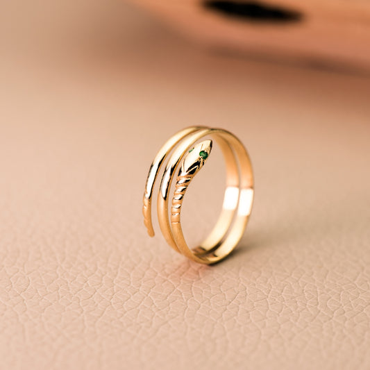 18K SORTIJA ORO AMARILLO SERPIENTE 2 VUELTAS CON OJOS DE ESMERALDAS