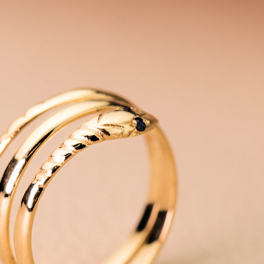 18K SORTIJA ORO AMARILLO SERPIENTE 2 VUELTAS CON OJOS AZULES