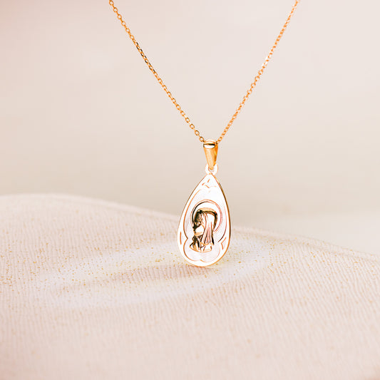 18K MEDALLA ORO AMARILLO GOTA CON NACAR BLANCO Y VIRGEN NIÑA 21 X 14 MM