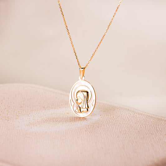 18K MEDALLA ORO AMARILLO OVALADA CON NACAR BLANCO Y VIRGEN NIÑA 17X12 MM