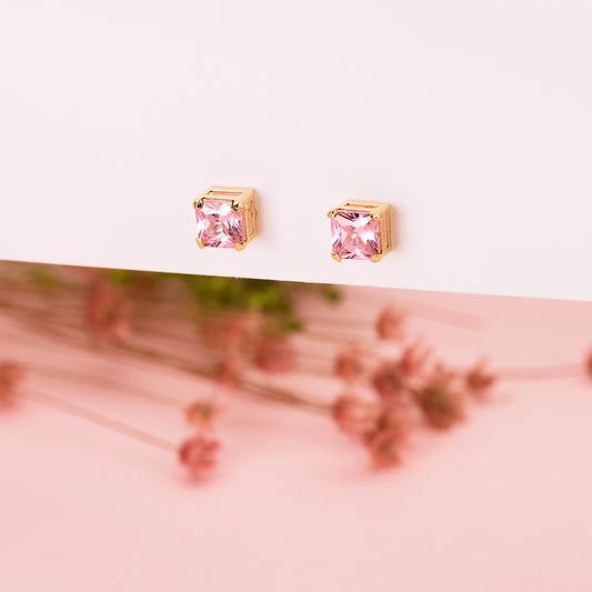18K PENDIENTES ORO AMARILLO CUADRADOS PIEDRA COLOR ROSA 5,5 X 5,5 MM. CIERRE PRESION